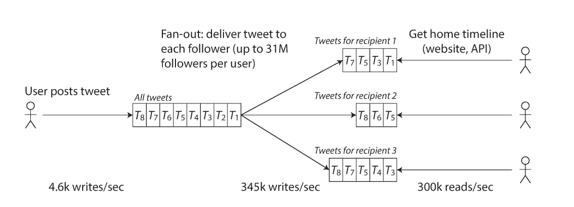 Twitter's scaling challenge was not primarily due to tweet volume, but due to fan-out: each user follows many people, and each user is followed by many people.