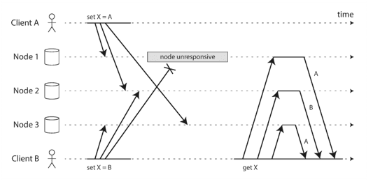 For example, the below diagram shows two clients, A and B, simultaneously writing to a key X in a three-node datastore: