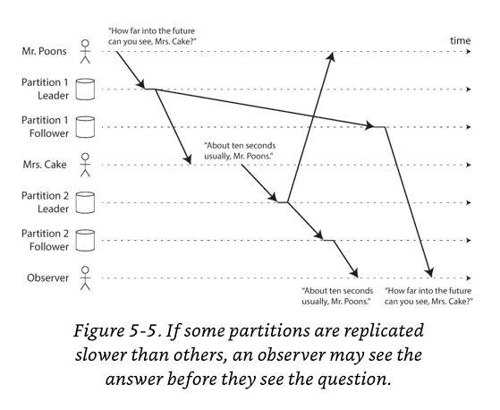 Consistent Prefix Read: guarantee that if a sequence of writes happens in a certain order, then anyone reading those writes will see them in the same order.