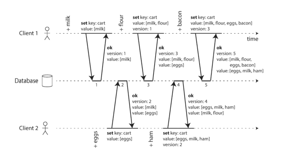 flourto the cart, so it thinks the current cart contents should be[milk, flour]. It sends this value to the server, along with the version number 1 that the server gave client 1 previously. The server can tell from the version number that the write of[milk, flour]supersedes the prior value of[milk]but that it is concurrent with[eggs]. Thus, the server assigns version 3 to[milk, flour], overwrites the version 1 value[milk], but keeps the version 2 value[eggs]and returns both remaining values to the client. - Similar steps are repeated.