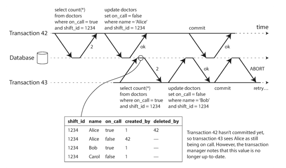 In the diagram below, transaction 43 sees Alice as having on_call = true, because transaction 42 (which modified Alice’s on-call status) is uncommitted. However, by the time transaction 43 wants to commit, transaction 42 has already committed. This means that the write that was ignored when reading from the consistent snapshot has now taken effect, and transaction 43’s premise is no longer true.