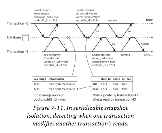 In above diagram, transactions 42 and 43 both search for on-call doctors during shift 1234. If there is an index on shift_id, the database can use the index entry 1234 to record the fact that transactions 42 and 43 read this data.