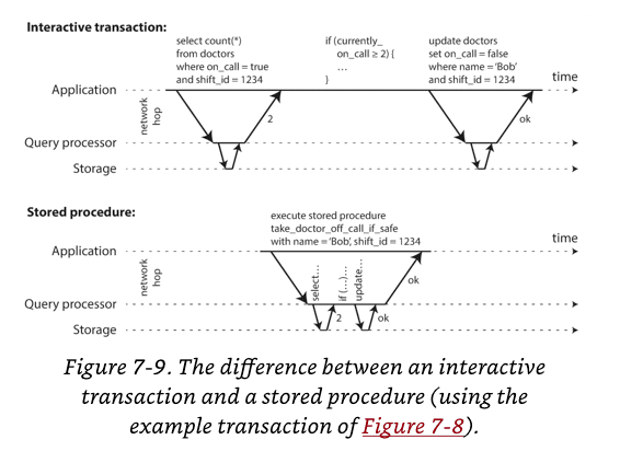 In the interactive style of transaction (such as a transaction equal to a single network request), a lot of time is spent in network communication between the application and the database. If you were to disallow concurrency in the database and only process one transaction at a time, the throughput would be dreadful because the database would spend most of its time waiting for the application to issue the next query for the current transaction. For this reason, systems with single-threaded serial transaction processing don’t allow interactive multi-statement transactions. Instead, the application must submit the entire transaction code to the database ahead of time, as a stored procedure. Provided that all data required by a transaction is in memory, the stored procedure can execute very fast, without waiting for any network or disk I/O.