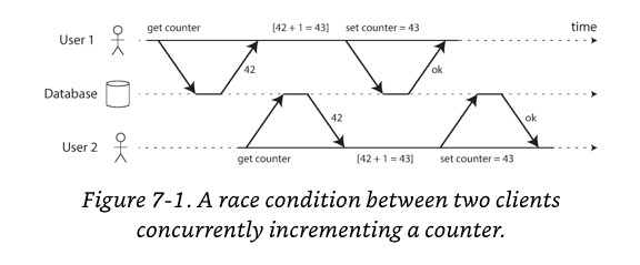 Concurrency bugs are hard to find by testing, because such bugs are only triggered when you get unlucky with the timing. Such timing issues might occur very rarely, and are usually difficult to reproduce. Concurrency is also very difficult to reason about, especially in a large application where you don’t necessarily know which other pieces of code are accessing the database. Concurrency issues (race conditions) only come into play when one transaction reads data that is concurrently modified by another transaction, or when two transactions try to simultaneously modify the same data.