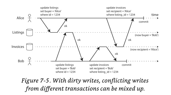 - For example, let's say two people, Alice and Bob are trying to buy the same car. Buying a car requires two database writes: the listing on the website needs to be updated to reflect the buyer, and the sales invoice needs to be sent to the buyer. In the case of Figure 7-5, the sale is awarded to Bob (because he performs the winning update to the listings table), but the invoice is sent to Alice (because she performs the winning update to the invoices table). Read committed prevents such mishaps.