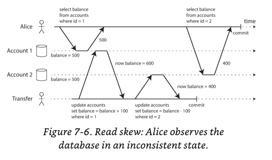 There are limitations of Read Committed isolation level. One example is a read skew, explained below.