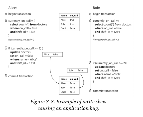 In the doctor-on-call example, each transactions is taking an action based on a premise (a fact that was true at the beginning of the transaction, e.g., “There are currently two doctors on call”).